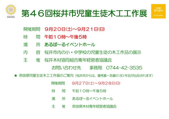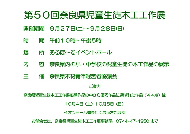 9月27日(土)28日(日)はあるぼ〜るイベントホールにて奈良県児童生徒木工工作展が開催されます。
